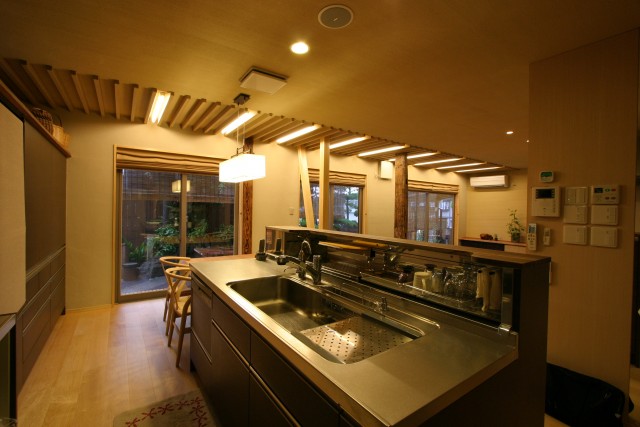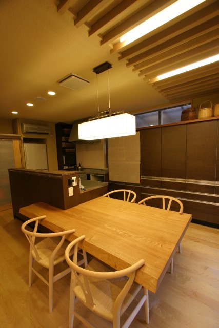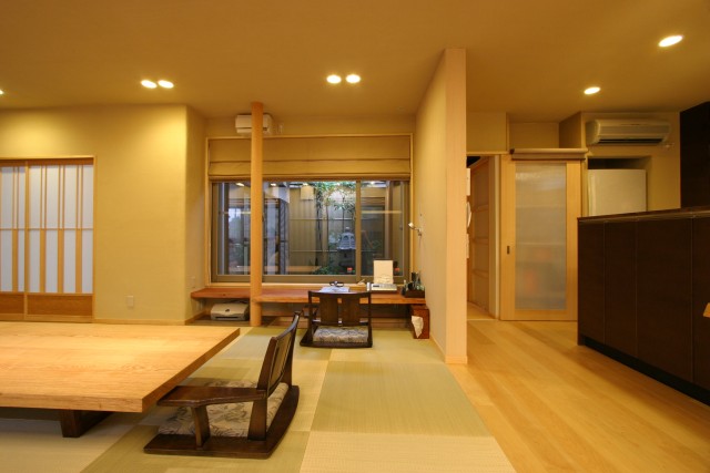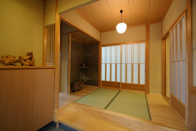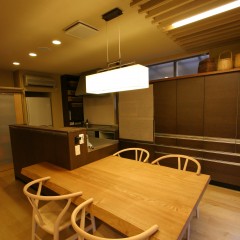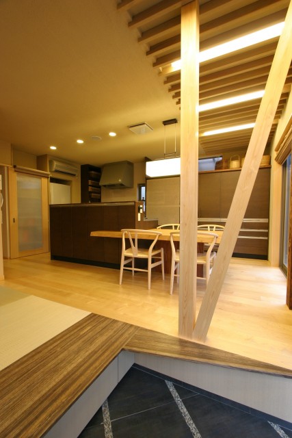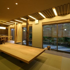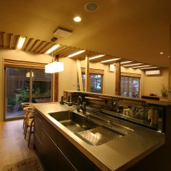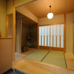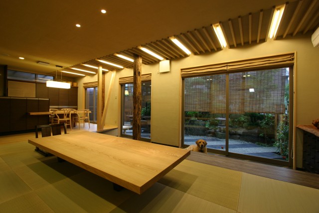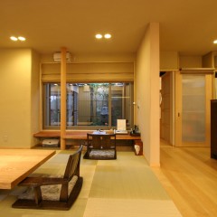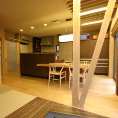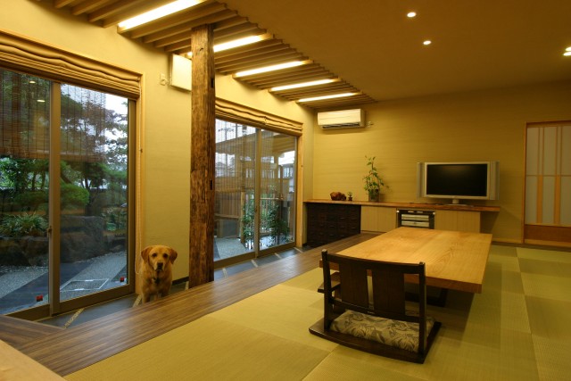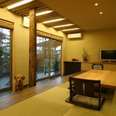 愛犬といつも一緒に暮らせるよう居間に土間を設け、庭と一体で利用できるようにした。土間にできた長い縁側の下は大きな収納になっており、釣り道具などがしまわれている。分かれていた個室を一つにし、お子さんやたくさんのお孫さんたちが一度に集まれるようになった。