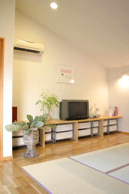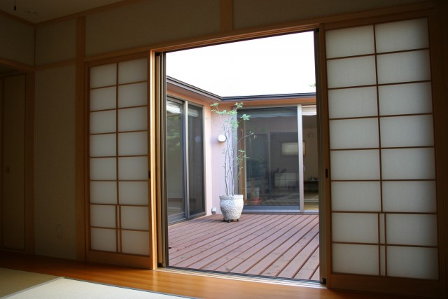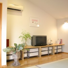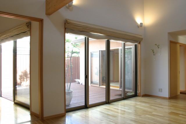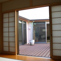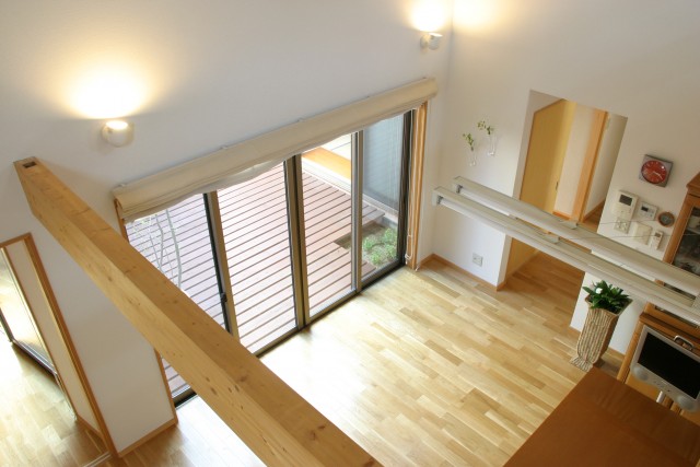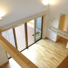 周囲を隣家に囲まれた北側道路の敷地だが、中庭のウッドデッキを介してLDKに光と風がたっぷり入る。お子さんの小学校入学をきっかけに、大きな吹き抜けの一部にスタディスペースを設け、家族と一緒に成長していくお家を目指した。