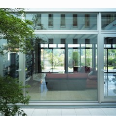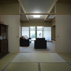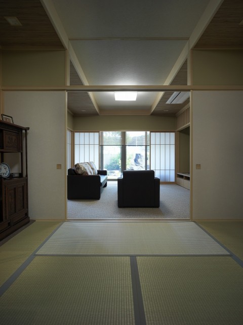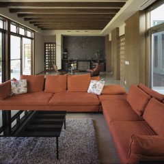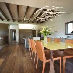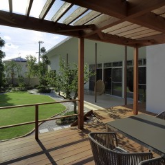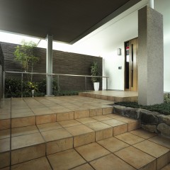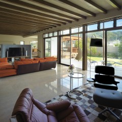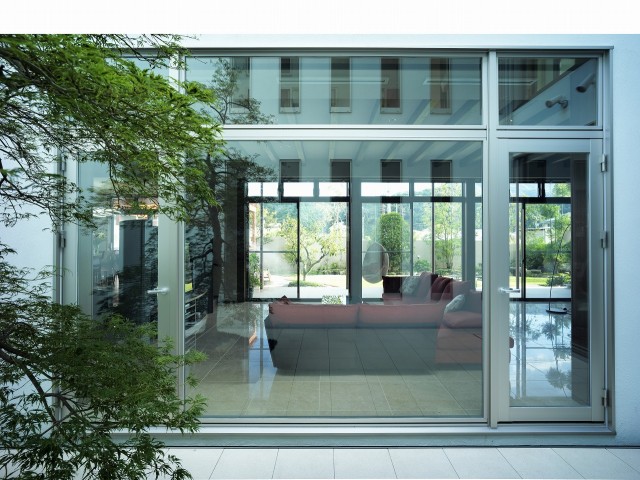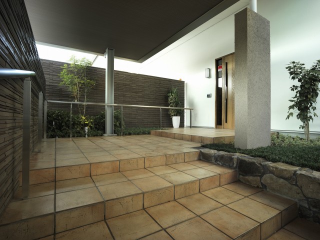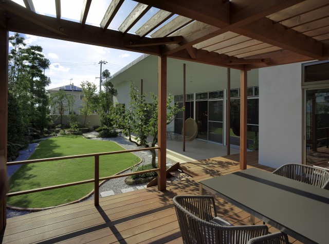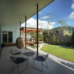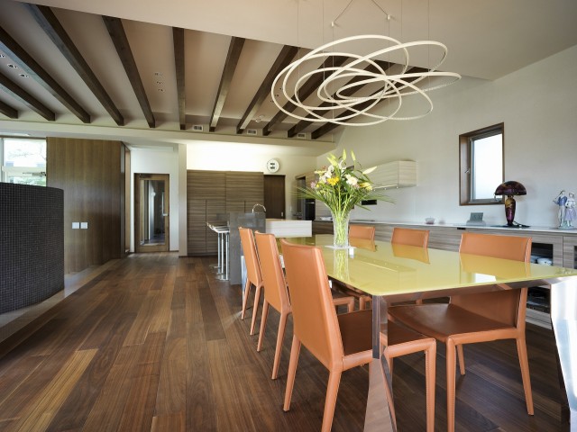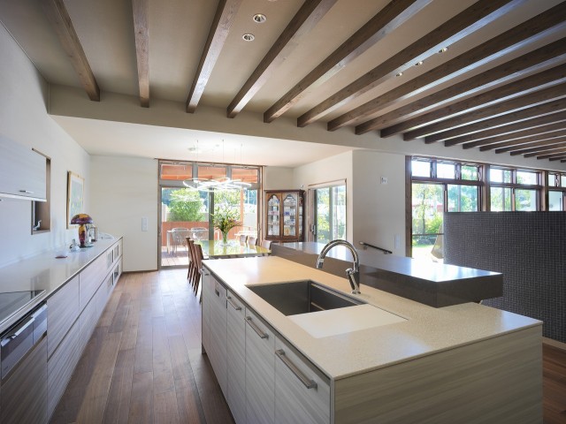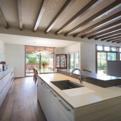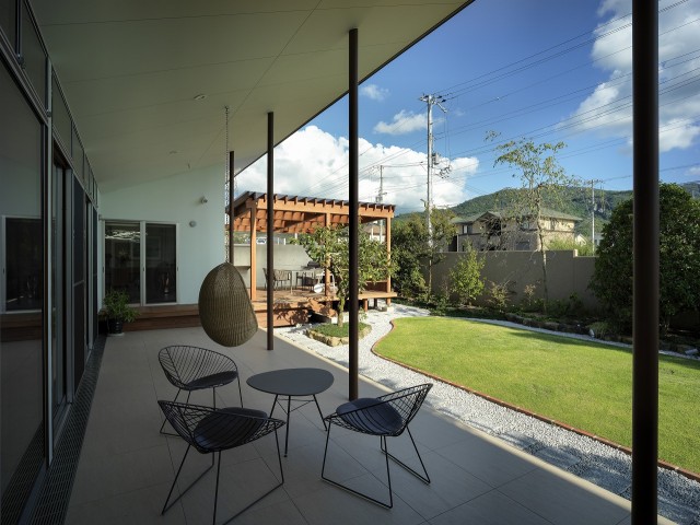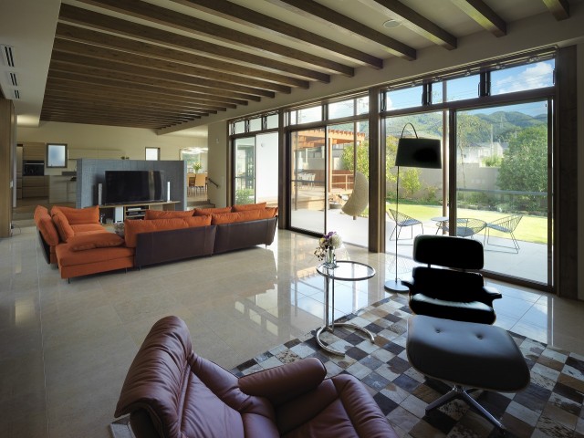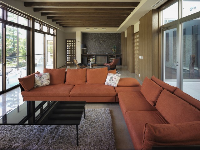 庭に突き出たテラスはダイニングスペースとして、BBQスペースとして欠かせないものになっていて、毎朝鳥たちも食事に訪れるという。大きな庭と中庭に囲まれたリビングには暖炉とオーディオコーナーが置かれ、普段お忙しいご夫婦がゆっくりとくつろげるコーナーになっている。