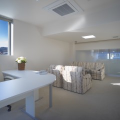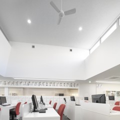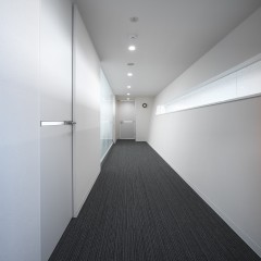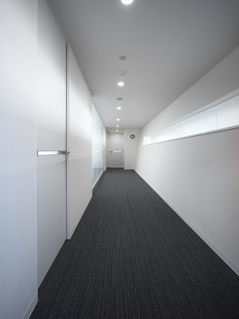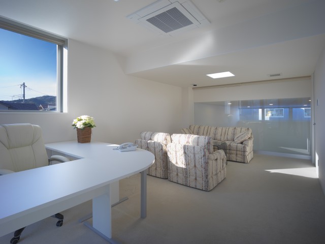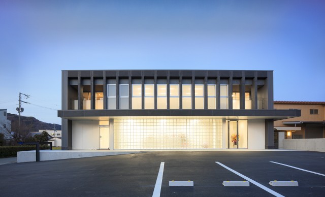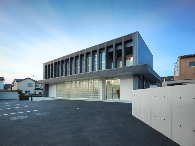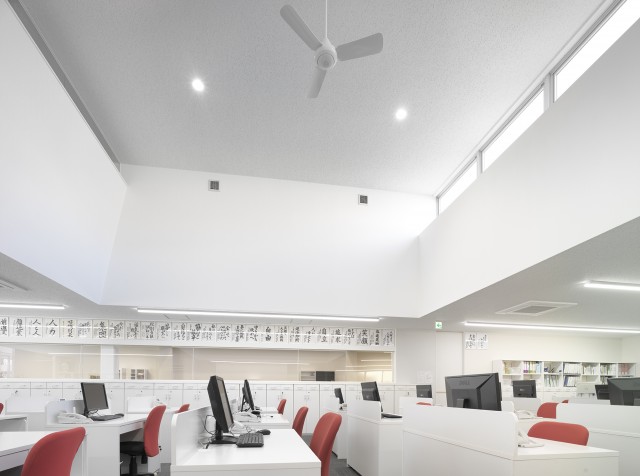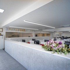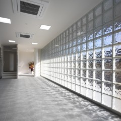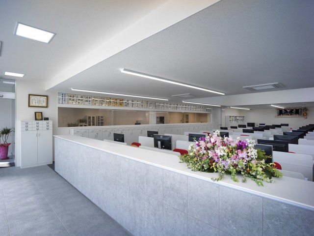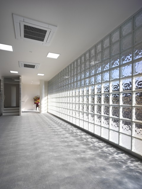 シンプルで清潔なオフィスがクライアントの要望。自社の製品が眺められる事務スペースが明るくなるように吹き抜けを設け、窓からの光を2階の廊下にまで取り込んでいる。サイズの大きなガラスブロックが受付周りをさらに明るくしている。