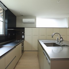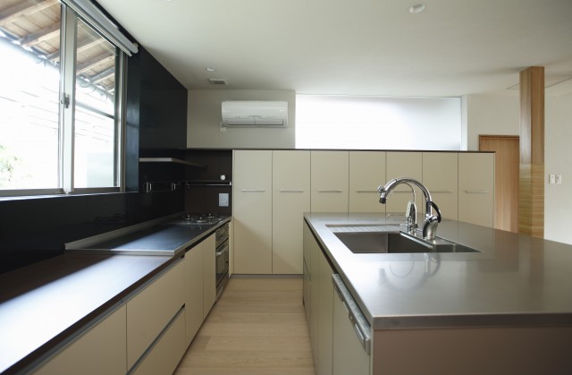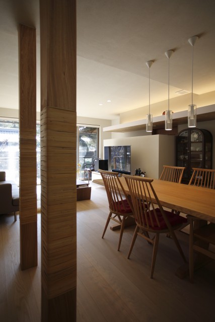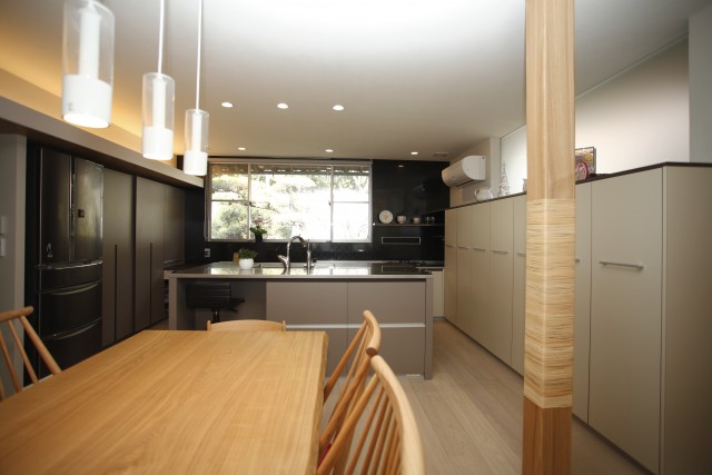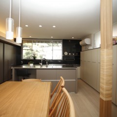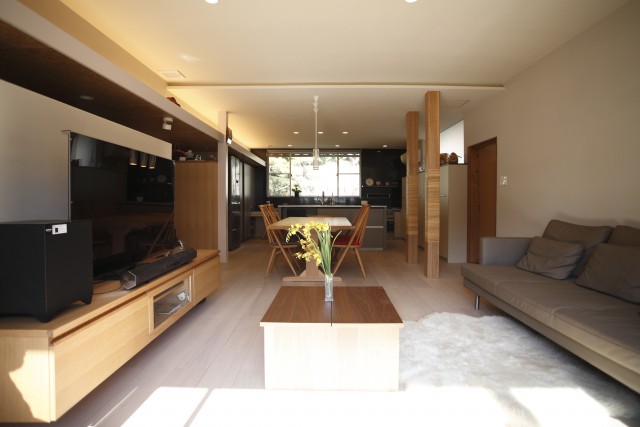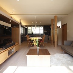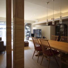 築50年の木造住宅の応接室を、ワンルームに取り込んでLDKに改築した。今まで見づらかった立派な表庭、裏庭の縁が眺められるようになり、季節を感じられるようになった。ご主人のために新たに書斎を設け、奥様のキッチンは収納を充実させた。